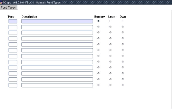 Different fund types can be defined by the user. These codes and descriptions are user defined and can differentiate between fund types such as Government Loan Fund, Provincial Bursary Fund (PWV), NSFAS or the different NSFAS donors etc. Different bursary codes can be linked to one fund type on {FBLO-1}