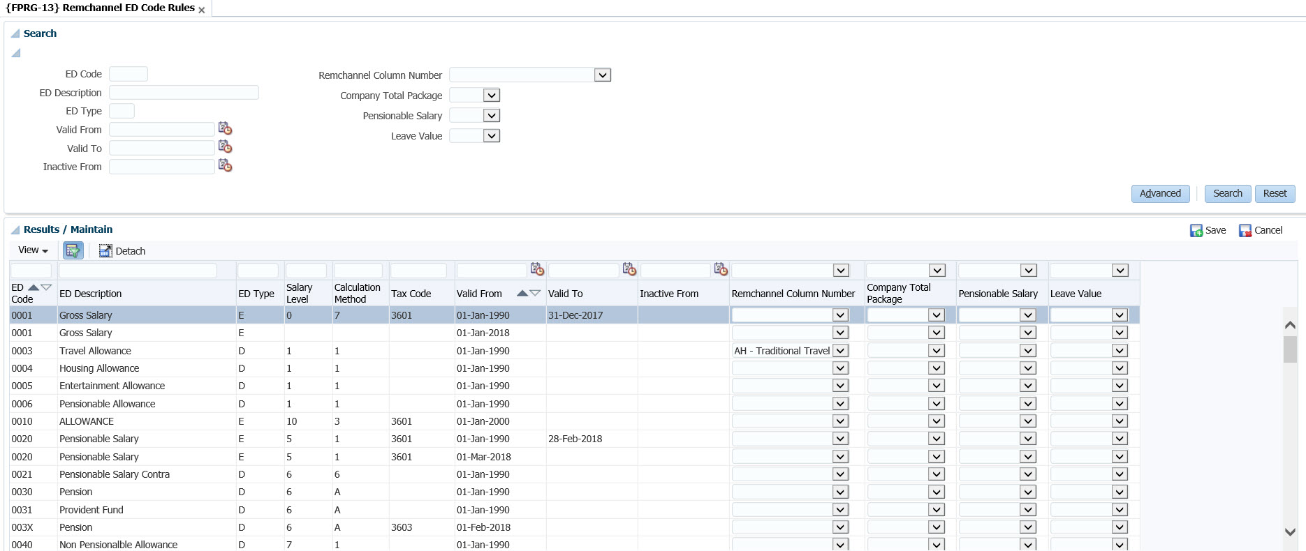 This menu option allows the user to define the rules, per ED Code, for Remchannel reporting purposes.  Only the new Remchannel fields are updateable, all other fields are displayed only and must be maintained on {FPRG-6}.
