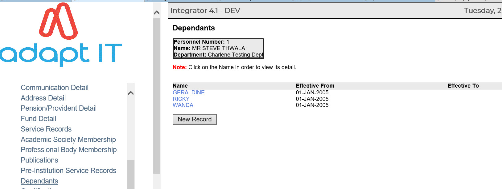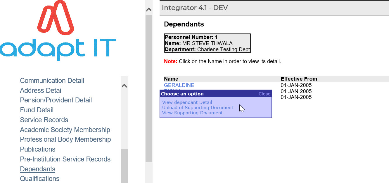 - A list of all the personnel members’ dependants is displayed on the left-hand side of the screen.