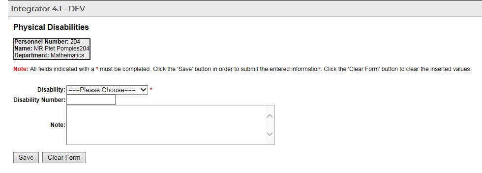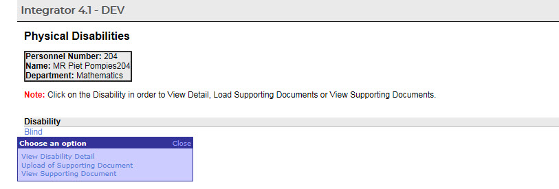 Supporting documentation may be added, viewed or deleted by the Personnel member by clicking on the specific Physical Disability once it has been saved.