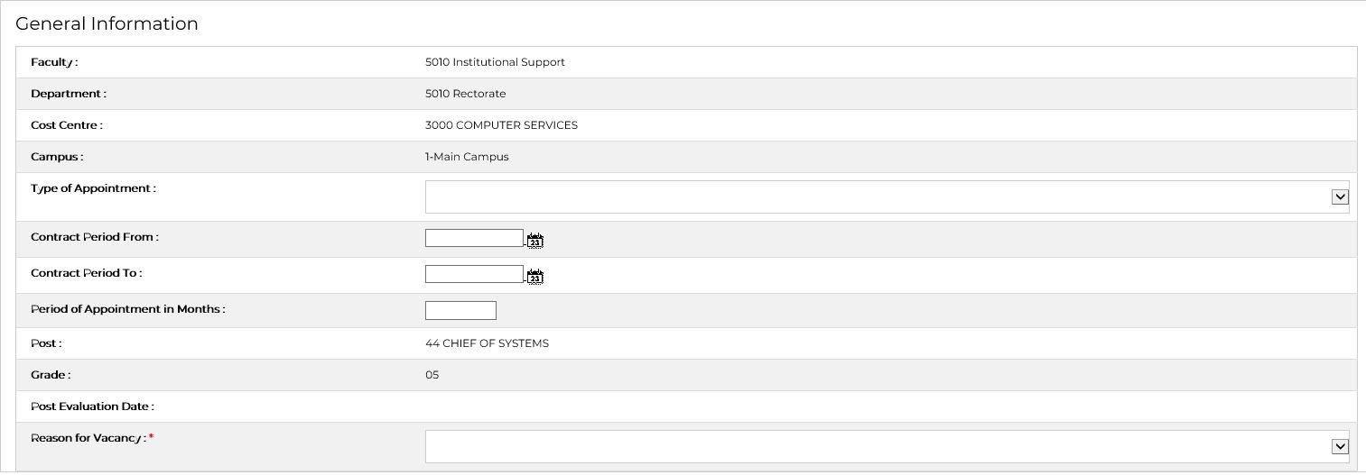 | Reason for Vacancy | LOV | Select the Reason for Vacancy from the LOV provided.