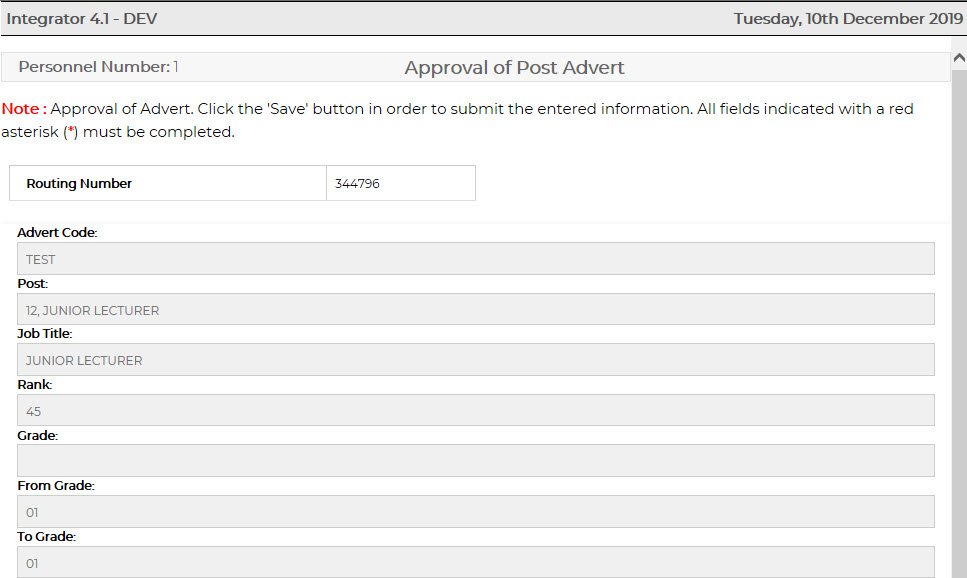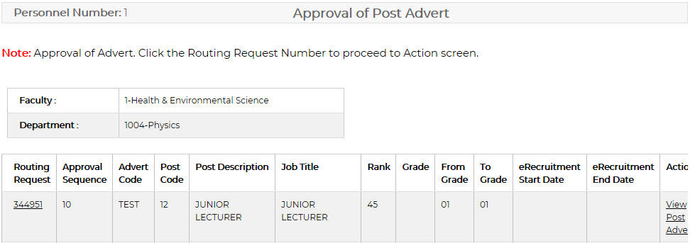 When the Approver clicks on the ‘Approval of Post Advert’ link the program will display the page below.