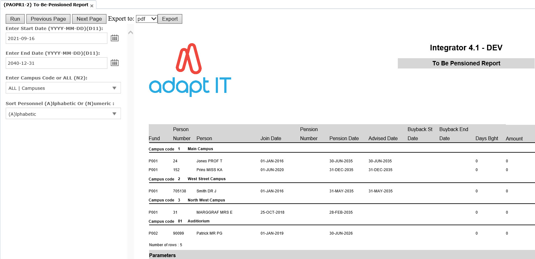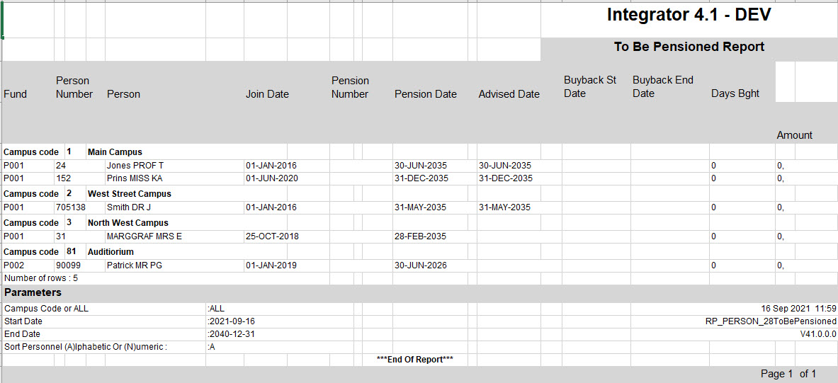 This option will print a report of in-service personnel to be pensioned i.e where Pension Date as defined on {PAOP-4} falls within the specified dates.