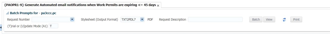This menu option is used to kick off route 'WRKP' where email notifications will be sent as set up on {GROU-1}, when a Work Permit{PBOP-23} is expiring in <= 45 days’ time (validated to sysdate when the process is run).