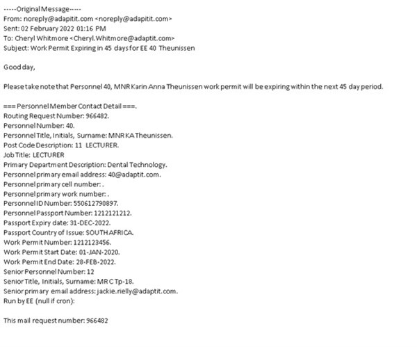 | Example of Email generated, using the default routing setup: | ||