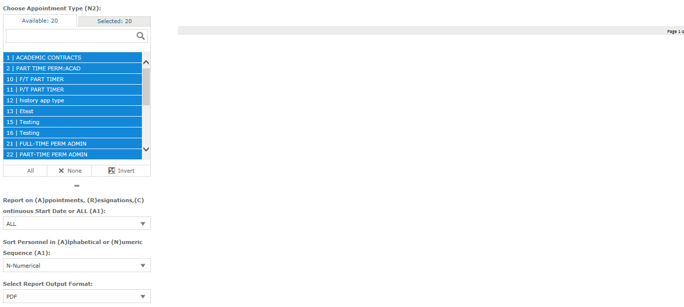 | Report on (A)appointments, (R)esignations, (C)ontinuous | A1 | Select one of the Following: A=Appointments R=Resignations C=Continuous The Continuous Start Date will select records from Appointment only where the Continuous start date falls between Start and End Date entered in Batch Prompt 3 and 4 above. If ALL is selected all Appointments and Resignations will be selected where the dates fall between the Start and End dates entered. |