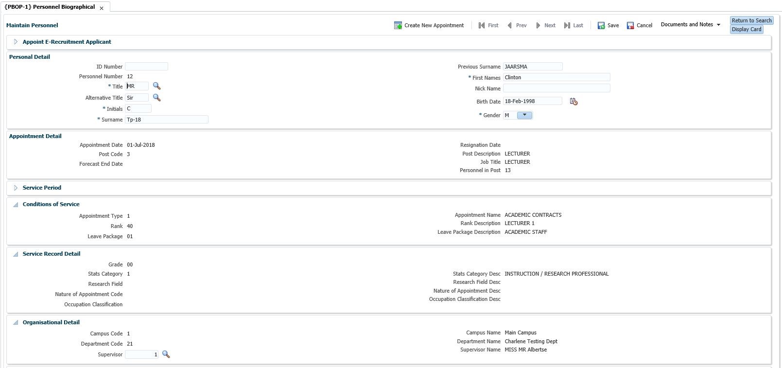 the service record). A future date may be entered i.e. a personnel record can be created before a person actually joins the institution. See Service Records {PBOP-2} for detail regarding this promotion or re-appointment of personnel. If a person is appointed via the eRecruitment System, the Appointment date will default as per the system date, this date may be changed before saving. |