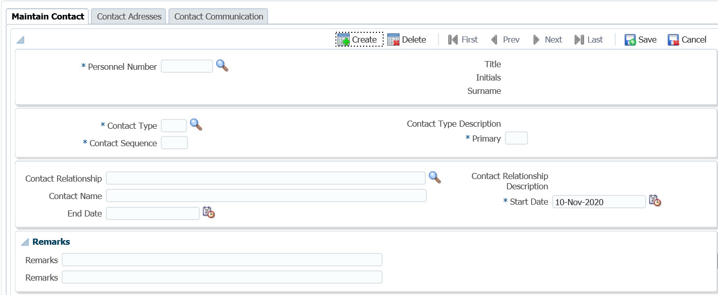 | Contact Type | A1 | Select from the LOV's provided. N- Next of Kin M- Emergency |