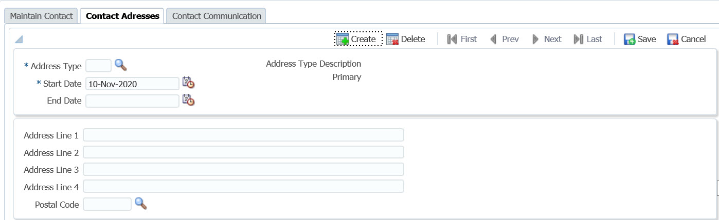| Contact Relationship | A20 | This field can be defined by the user or may be chosen from the LOV's provided |