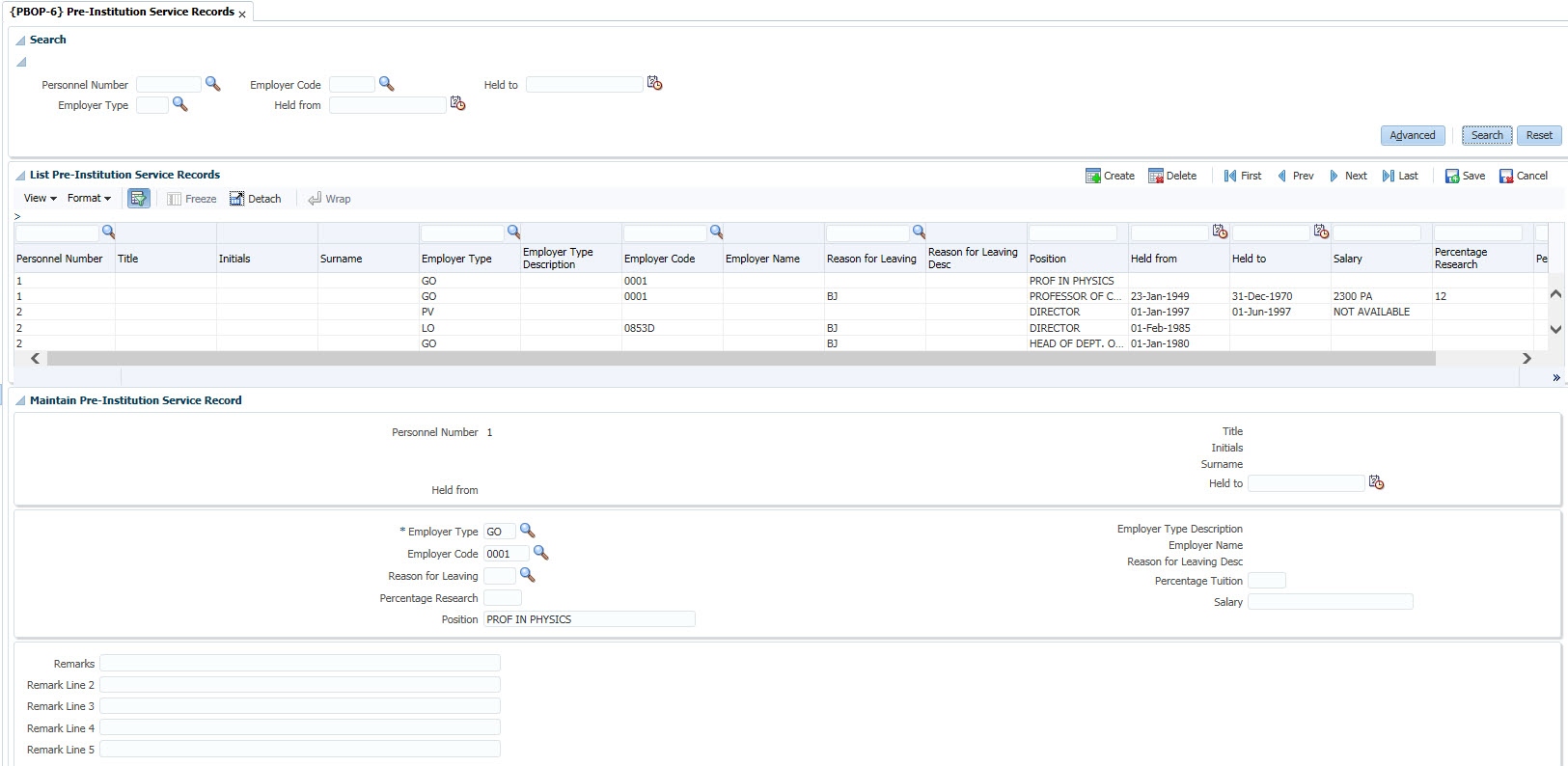| Position | A40 | Enter the Position of the Pre-Institution Service Record |