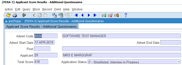 | Advert Code | A10 | Only Advert Codes where there is at least 1 Applicant will be displayed in the LOV. |