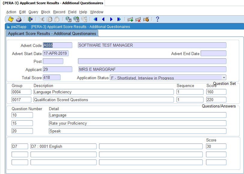linked per Group, to an Advert placed on eRecruitment and the score achieved by