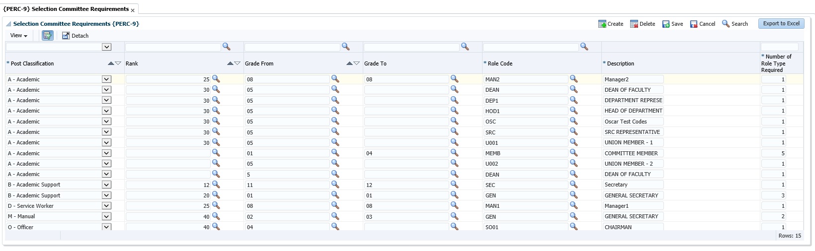 This Menu Option is used to define the selection commitee composition required per Post Cloassification & Rank/Grade.