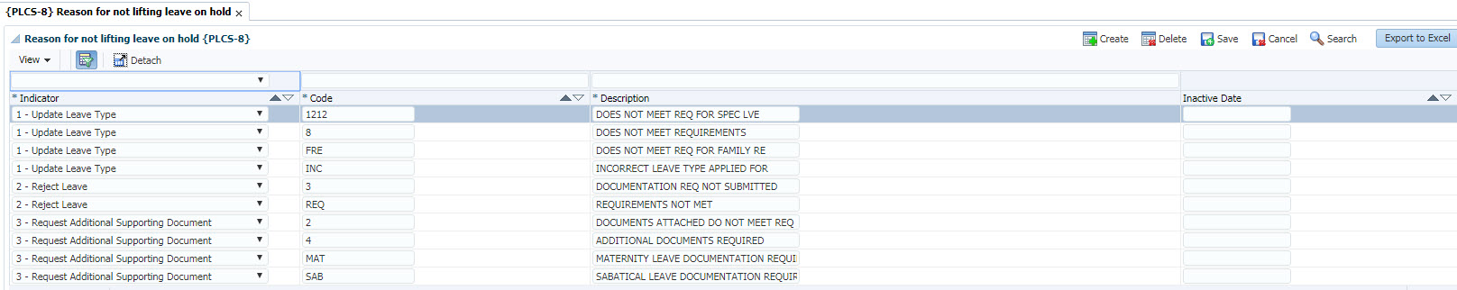 Select Indicator: This is a hard coded static list of values consisting of the following Actions that require a Reason: 1- Update Leave Type