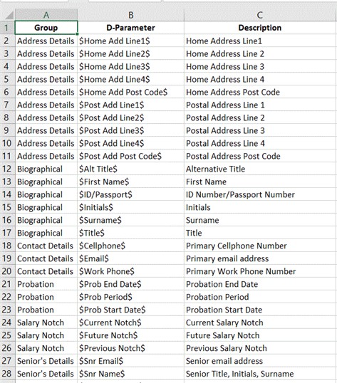 | Group | A40 | This is the group that the D Parameter is linked to i.e. Biographical data, Service Record, Contact Details, Notch Detail etc. |