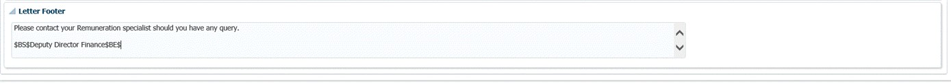 | Footer Content | A400 | The user will define the letter content here using the special Characters and D-Parameters. |