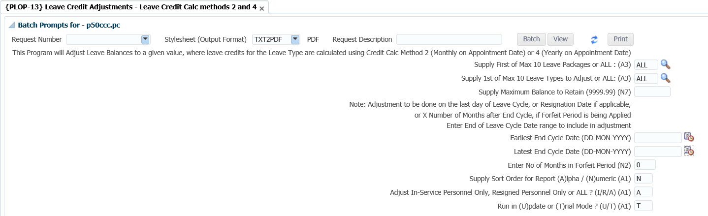 | 2 | Supply 1st of Max 10 Leave Types to Adjust or ALL'. | A3 | The program will only consider Leave Types in Leave Packages that have a credit calc of '2' or '4' for ALL. |