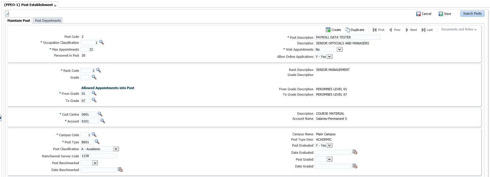 The information entered in this structure can be validated with Validate Posts {PPEO-10} NB:When a Department Code is changed a warning message will display as a reminder to change the service records for the personnel in the post. |