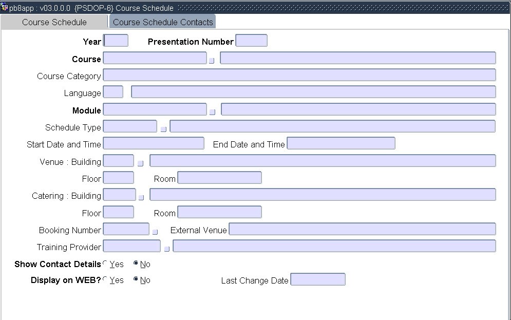 | Show Contact Details | A1 | The value in this field is not recorded on the database. If (Y)es is selected and the user navigates to the next block, the contact details of the Training Provider will be opened. If (N)o is selected and the user navigates to the next block, the block with the Contact Persons for the presentation will be opened. |