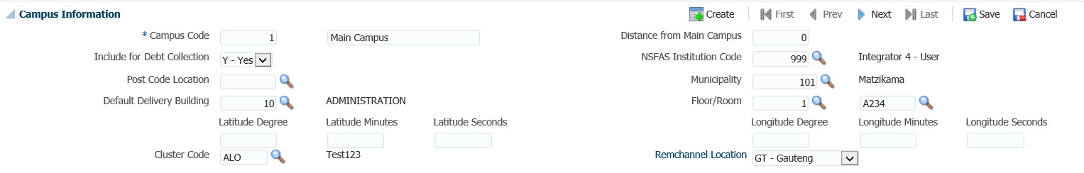 | NSFAS Institution Code | N4 | Enter or use LOV to select the NSFAS (National Student Financial Aid Scheme) Code. The codes are similar to the Institution Codes but the fourth character in the code is used to indicate campus. An institution may specify 4 institution codes according to the campus. Students linked to e.g. Pretoria campus may then be able to receive higher/lower amounts due to higher/lower cost of living than students linked to Soweto Campus (Johannesburg). These codes are therefore used to indicate how the funding will be done. The link on offering type is made in {GCS-5}. |